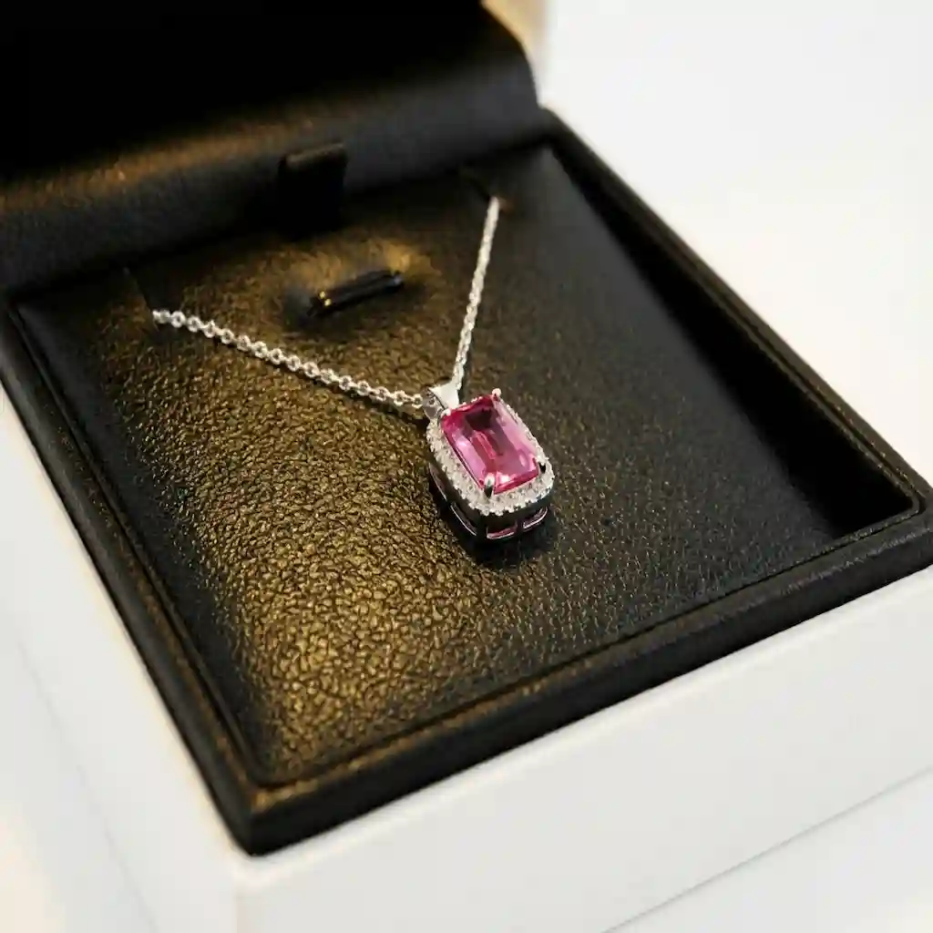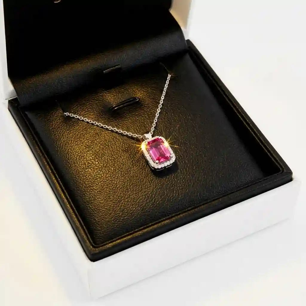 Discover the elegance of the Natural Pink Topaz Pendant Pakistan collection, designed for those who seek beauty with a purpose. At Pakistan Gemstones, we have crafted this masterpiece using a genuine, deep-pink Gulabi Pukhraj, cut in a classic emerald shape to maximize its color depth. It is surrounded by a halo of brilliant white stones that amplify its energy and sparkle.